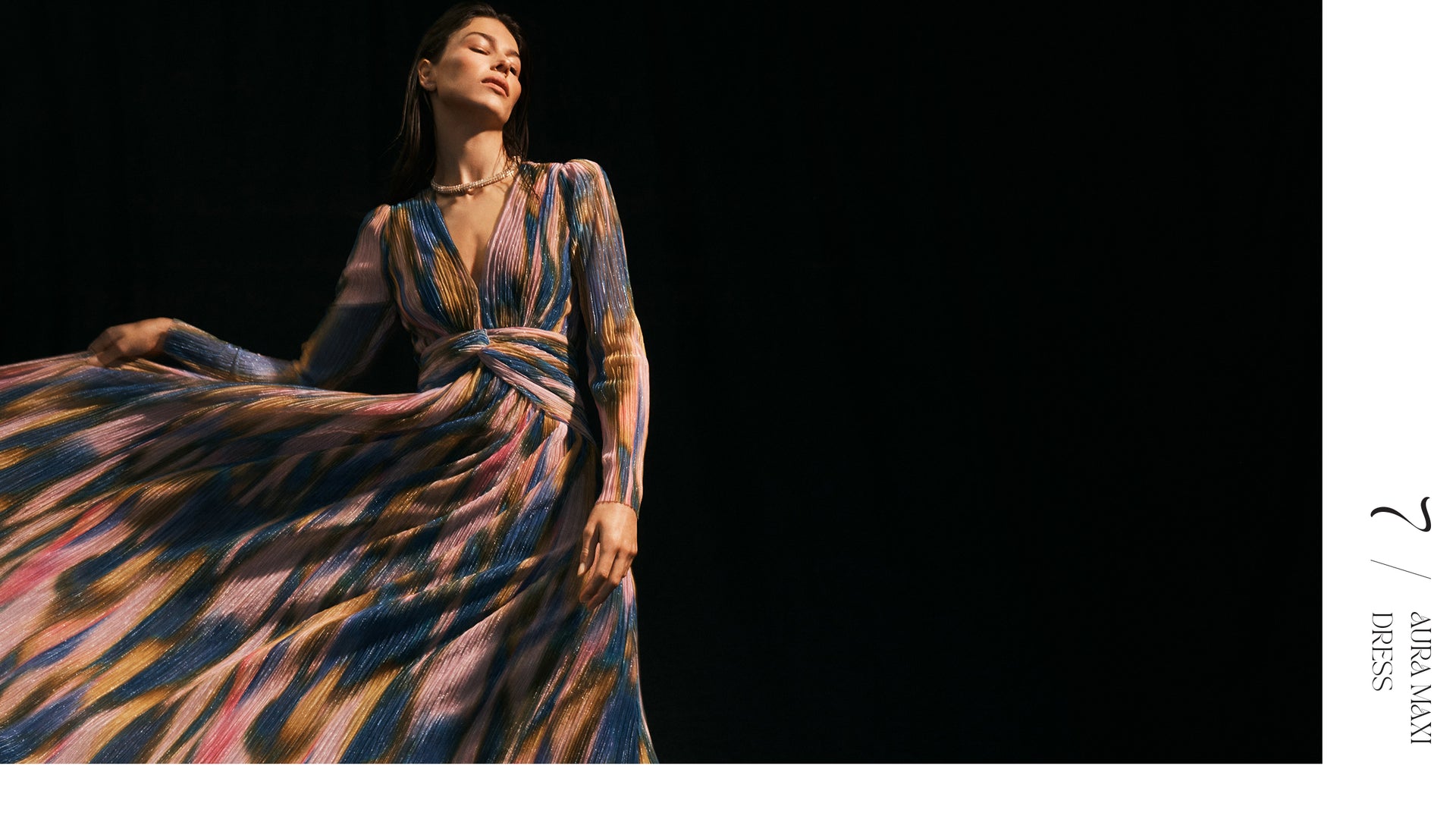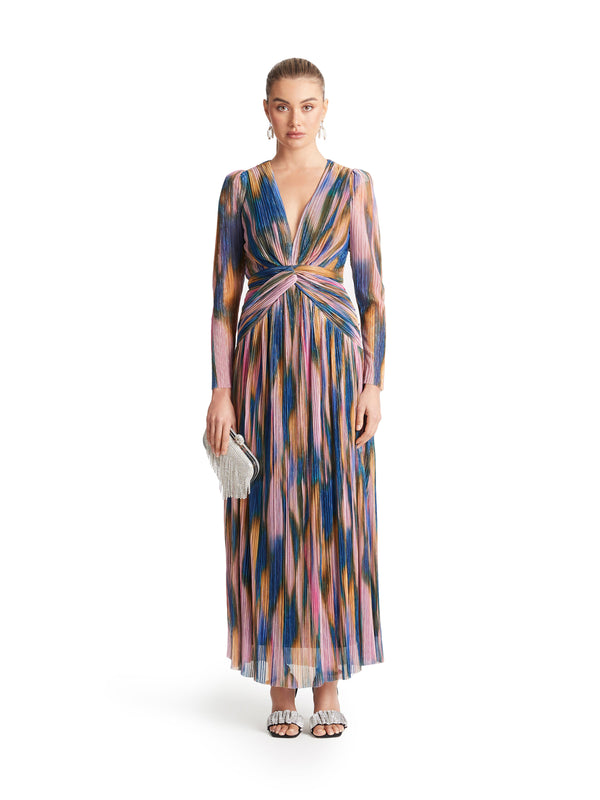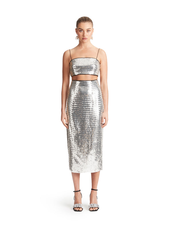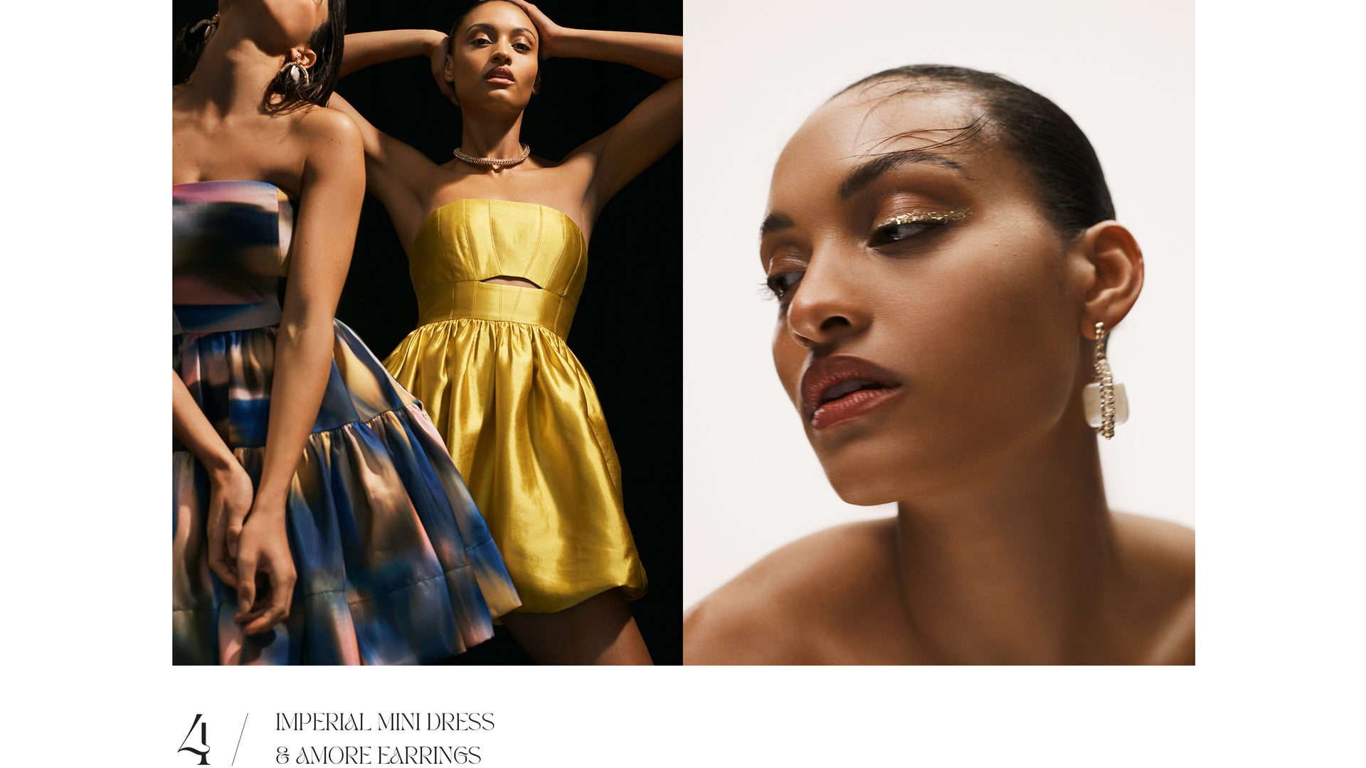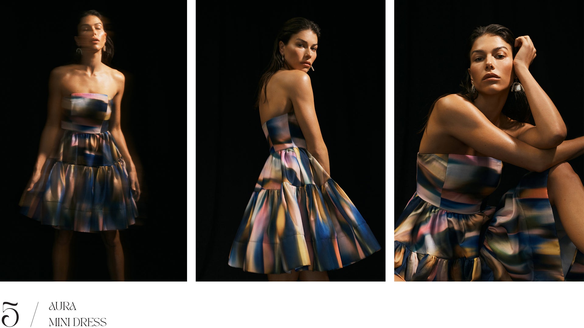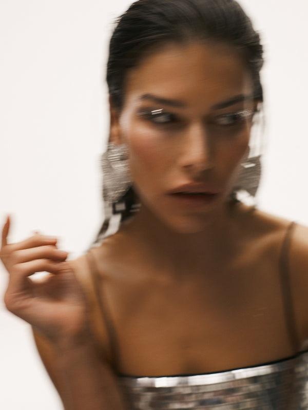 There's a disco decadence in iridescent sequin separates, instantly setting a party mood. Dresses drip in liquid metallic prints that hero a spectrum of cobalt, gold and pink.
