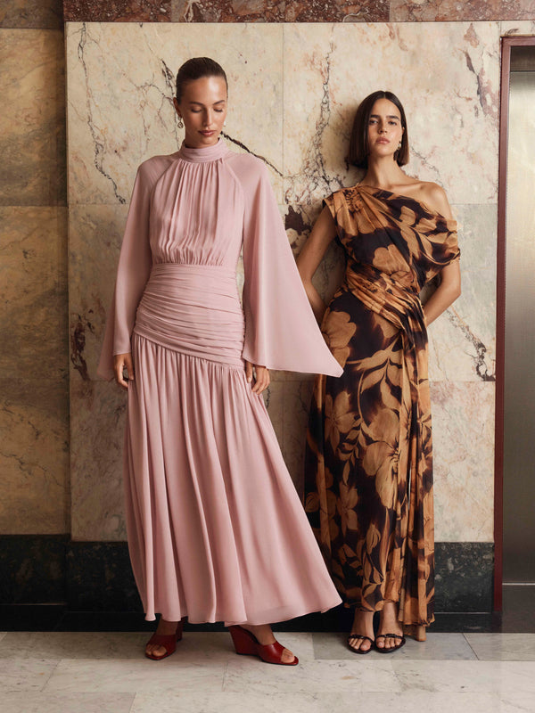 An exploration of structure and softness. Sculpted tailoring balanced by fluid drape and sheer layering. Texture, tonal depth and soft-focus florals create a world that feels rich, considered and enduring.
